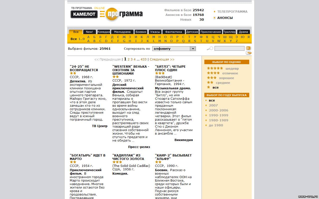 film.cmlt.tv - структурированная база анонсов кинофильмов с возможностью сортировки (по алфавиту, оценке редакции, году выхода в прокат, жанру) и поиска (по актерам, режиссерам, названиям и описаниям). На страницах портала доступны фильмографии и биографии актеров и режиссеров.